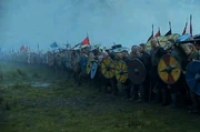 However, the Saxons are yet again met with hundreds of arrows pouring down from the top of a hill on which hundreds of Viking archers are inflicting heavy casualties on the English soldiers. The forces led by Bjorn and King Harald then emerge from the top of the hills and form a massive shield wall in order to block the way to Repton. The battle then engages, the forces colliding into each other with great strength, and the hand to hand combat begins, which turns into the Viking's favor. Bjoin gains of King Ecbert, before his suicide, legitimize their claim over East Anglia, honoring the promises done to Ragnar, many years ago before his death.